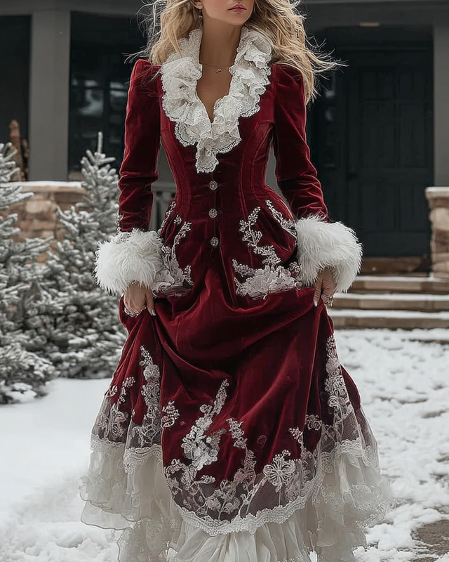 CHRISTMAS THEMED ELEGANT EMBROIDERED WARM CONTRAST COLOR DRESS 6191