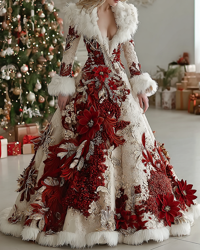 Women's Autumn/Winter Elegant Christmas-Themed Embroidered Art Comfortable Warm Thick Dress 4805