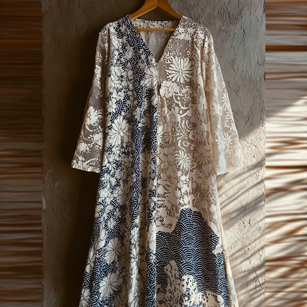 Japanese Waves Patchwork Hollow Lace Flowy Maxi Dress