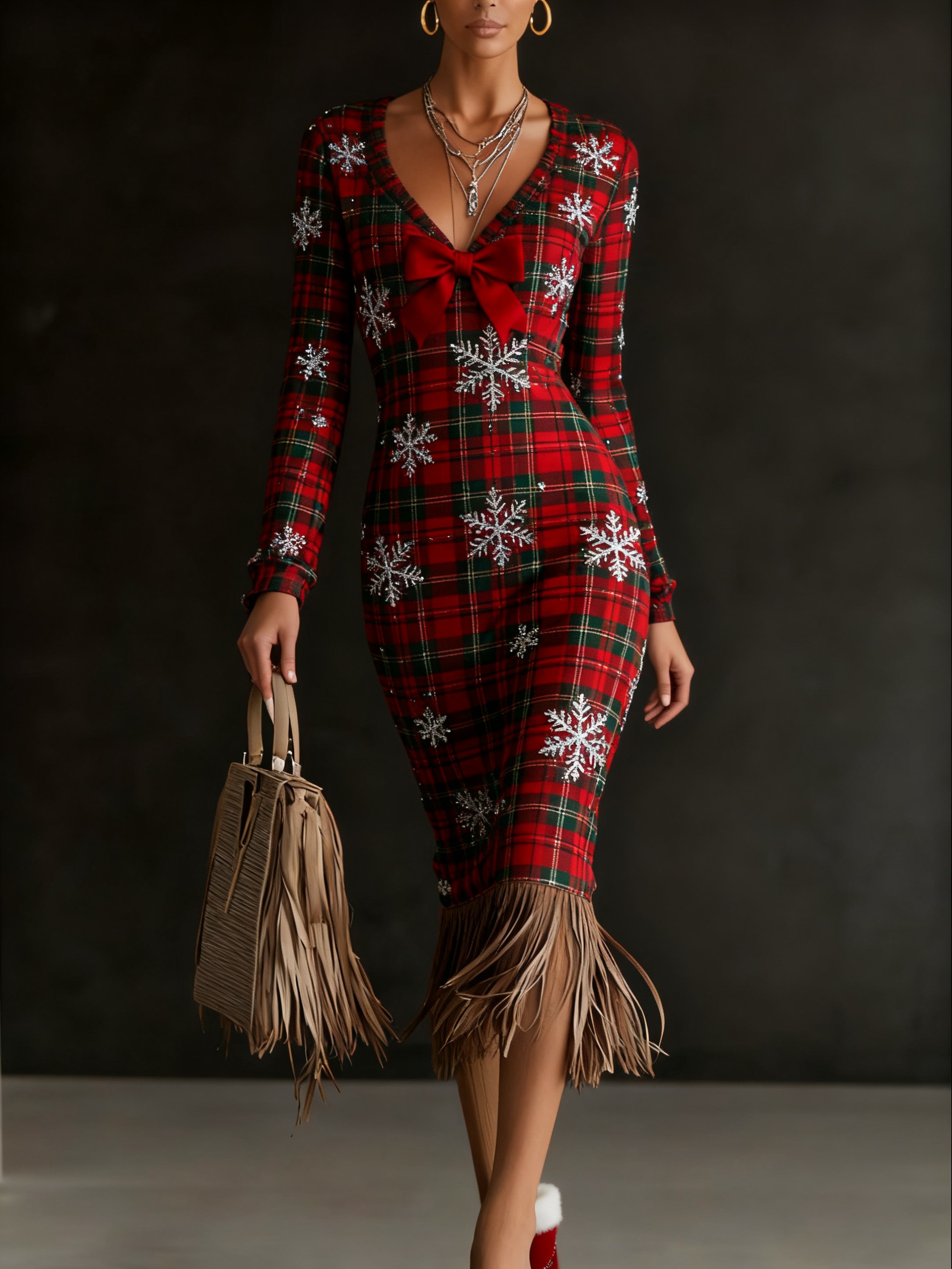 Christmas Eve Party Dress Printed Knitted Tassel Hoop Long Sleeve Midi Dress