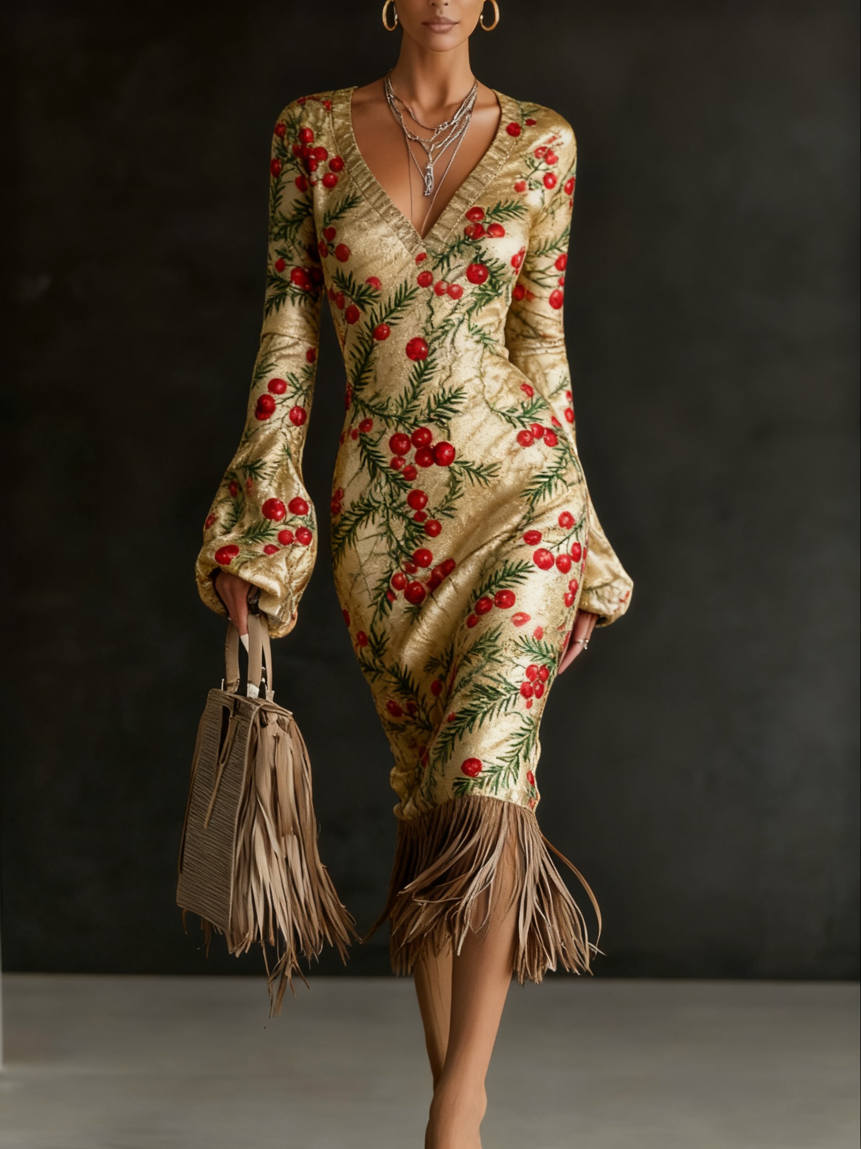 Christmas Eve Party Dress Printed Knitted Tassel Hoop Long Sleeve Midi Dress