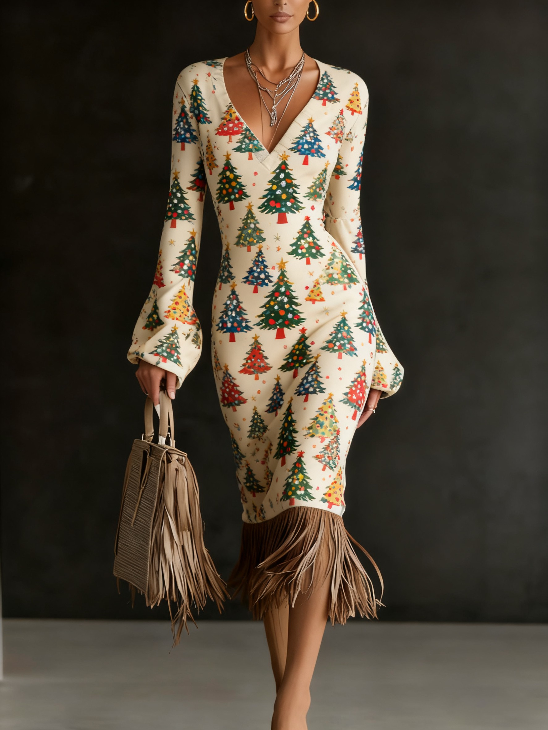 Christmas Eve Party Dress Printed Knitted Tassel Hoop Long Sleeve Midi Dress