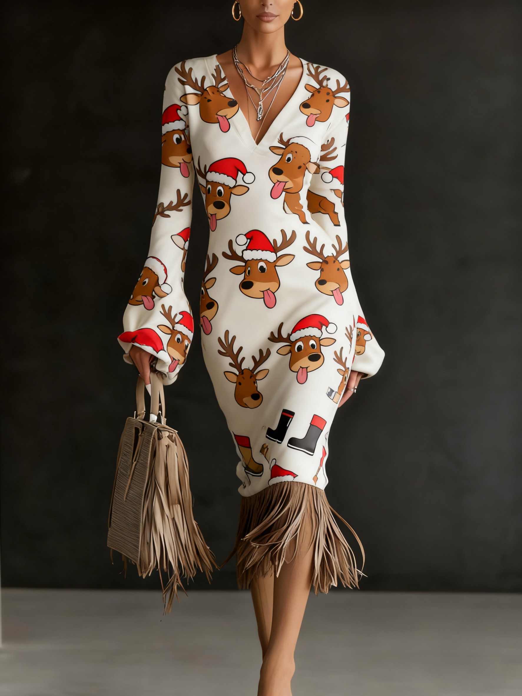 Christmas Eve Party Dress Printed Knitted Tassel Hoop Long Sleeve Midi Dress