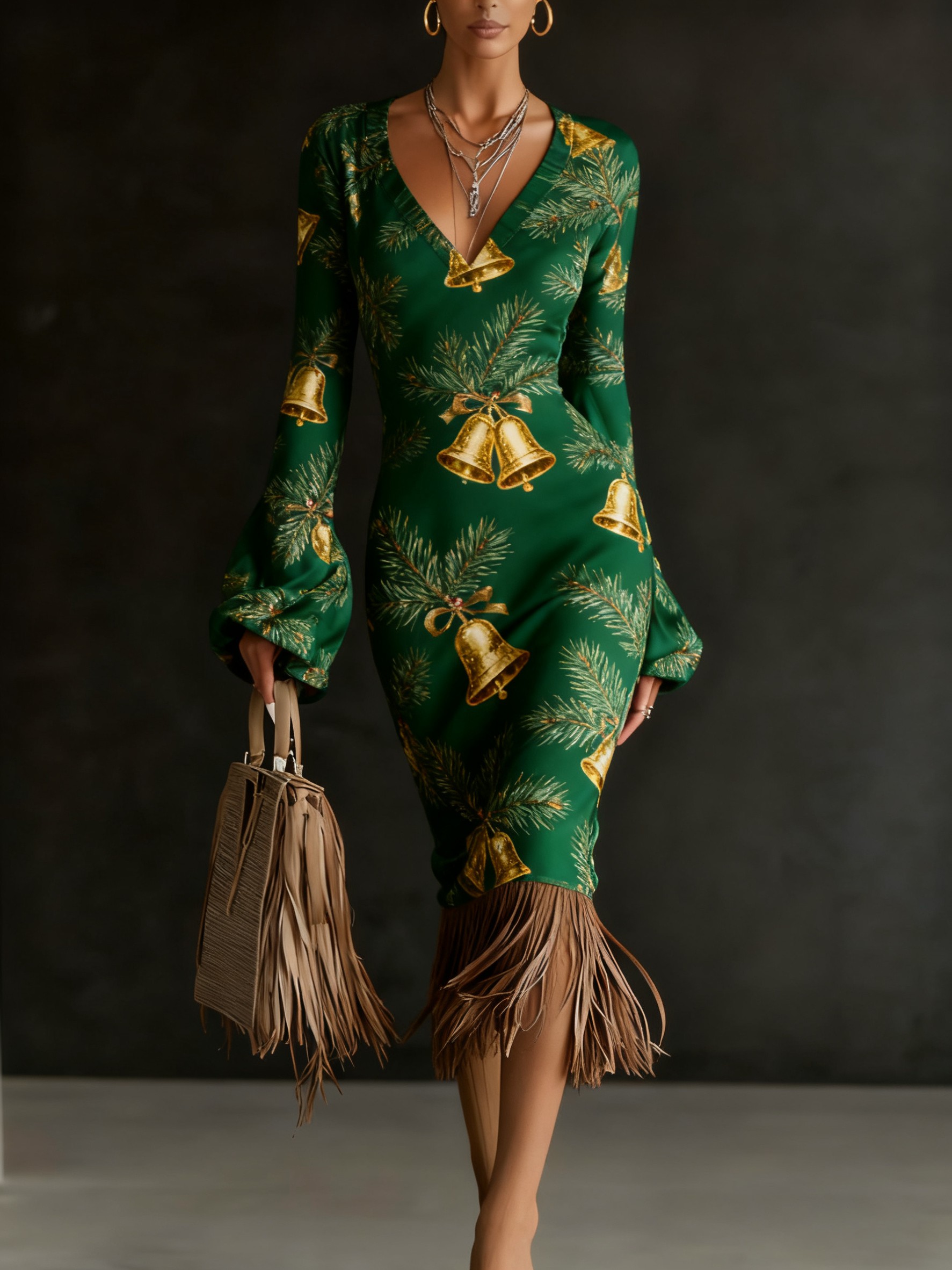 Christmas Eve Party Dress Printed Knitted Tassel Hoop Long Sleeve Midi Dress