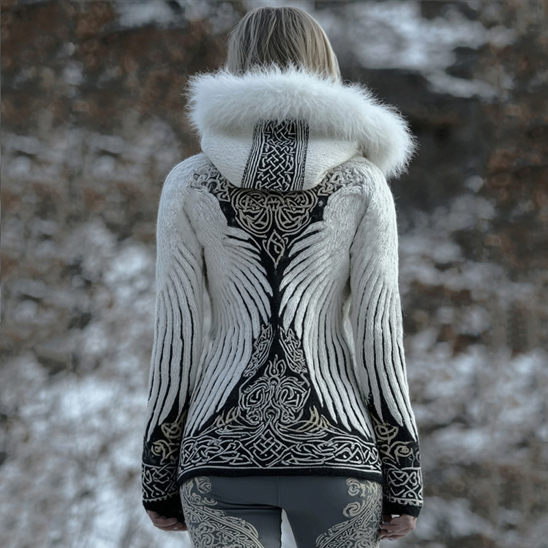 Viking Wings Celtic Contrast Color Fur Trim Hooded Sweater