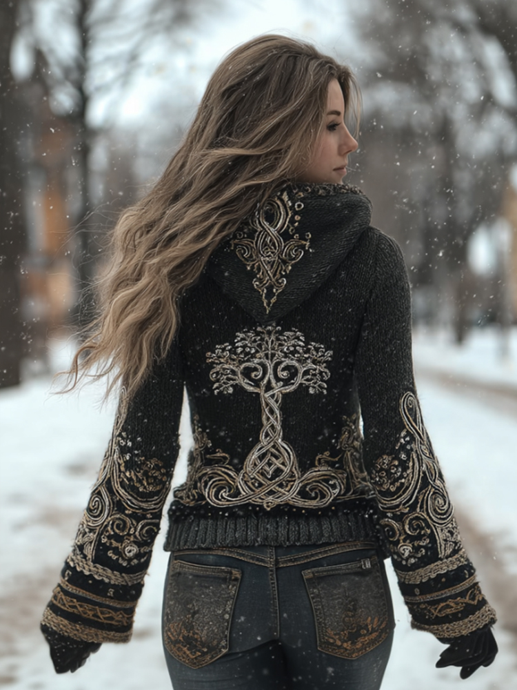 Women's Viking Retro Gold Tree Of Life Warm Hoodie Sweater